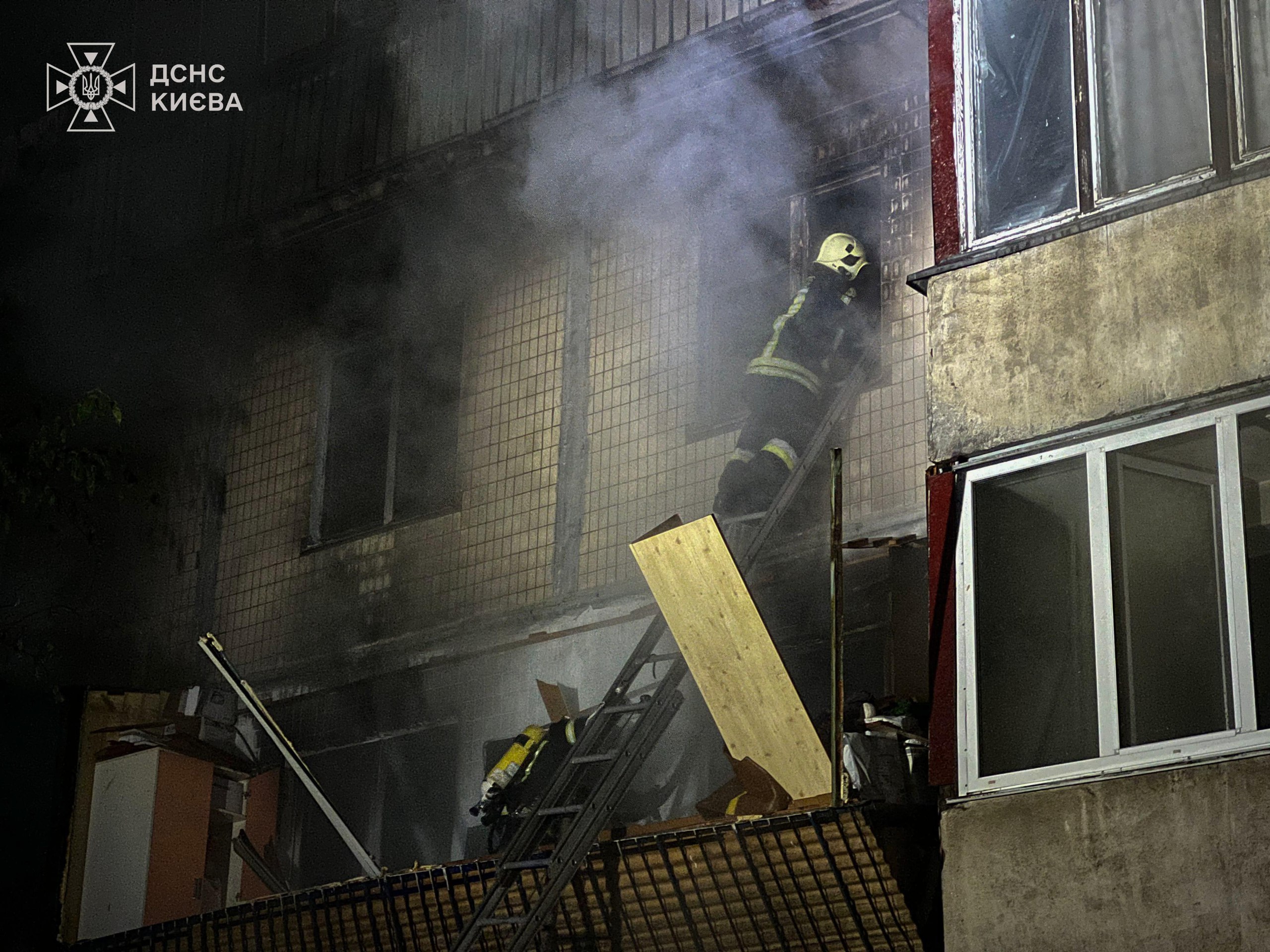 За словами мера столиці Віталія Кличка, у Деснянському районі Києва сталося потрапляння "Шахеда" до дев'ятиповерхового житлового будинку на рівні другого-третього поверхів. Там виникла пожежа після влучення, рятувальники евакуювали 13 людей із верхніх поверхів.