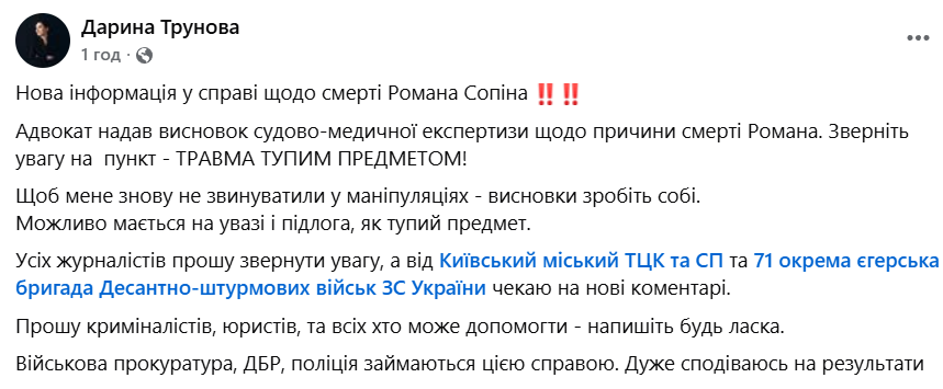 "Нова інформація у справі про смерть Романа Сопіна. Адвокат надав висновок судово-медичної експертизи щодо причини смерті Романа. Зверніть увагу на пункт "травма тупим предметом"!" - йдеться у заяві журналістки.