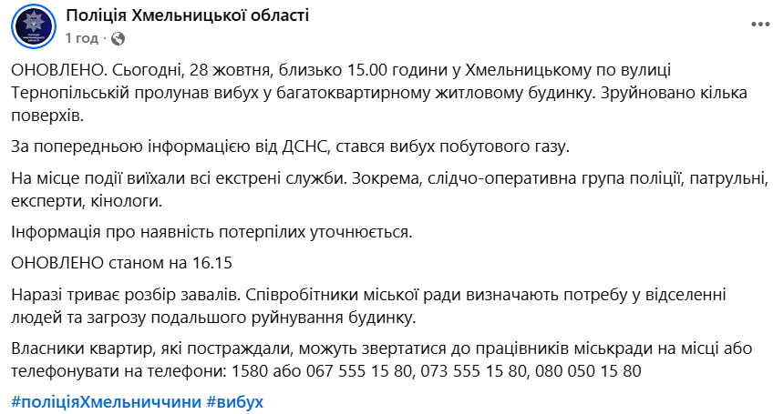 Наслідки вибуху побутового газу у Хмельницькому. Фото: facebook.com/policia.Khmelnytskoi.oblasti