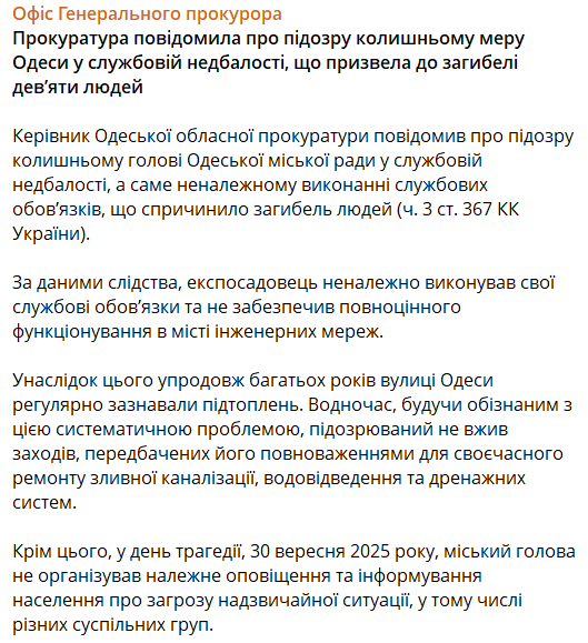 Прокуратура офіційно підтвердила, що колишній мер Одеси Геннадій Труханов отримав підозру у службовій недбалості, яка призвела до загибелі дев'яти осіб під час нещодавнього потопу у місті.