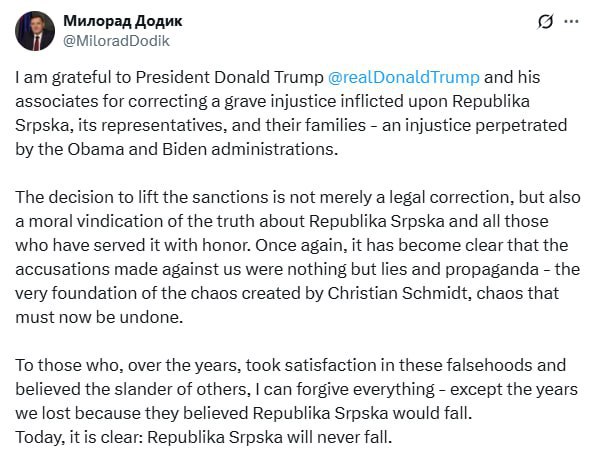 "Я вдячний президенту Дональду Трампу та його соратникам за виправлення важкої несправедливості, завданої Республіці Сербській, її представникам та їхнім сім'ям – несправедливості, вчиненій адміністраціями Обами та Байдена. Рішення про зняття санкцій – це не просто юридичне право Сербській і всіх тих, хто служив їй з честю. Знову стало зрозуміло, що звинувачення, висунуті проти нас, були лише брехнею і пропагандою... Тим, хто протягом багатьох років задовольнявся цими помилковими відомостями і вірив наклепу інших, я можу пробачити все, окрім втрачених років. ніколи не впаде", – заявив Додік.