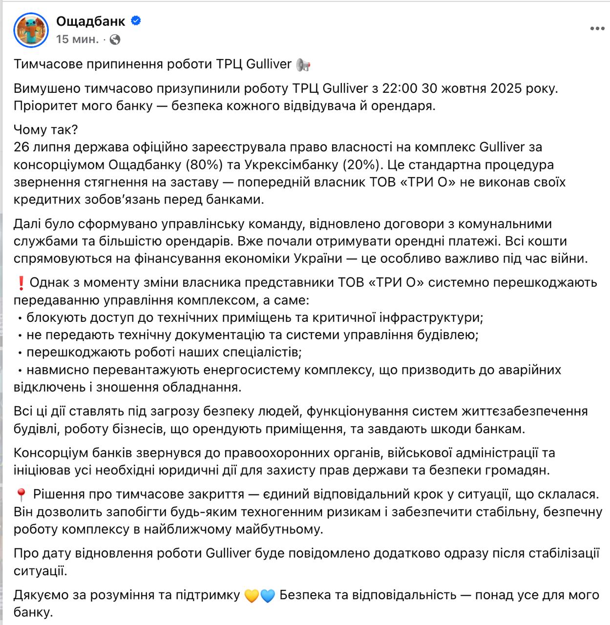 Пізніше Ощадбанк офіційно підтвердив закриття ТРЦ Gulliver через корпоративний конфлікт, наголосивши на тимчасовому характері заходів, але не вказавши терміни відкриття.