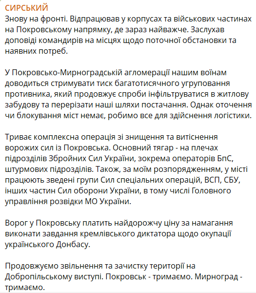 "Покровськ - тримаємо. Мирноград - тримаємо", - підсумував Сирський.