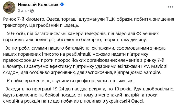 "Можемо надати підтримку правоохоронцям проти проросійських організованих елементів з ринку "7-й кілометр". Гарантуємо ефективну підтримку ударними екіпажами FPV, Mavic зі скиданням, для особливо агресивних, для заспокоєння, відпрацюємо Vampirе (чеська РСЗВ - Ред.)", - написав вiйськовий.