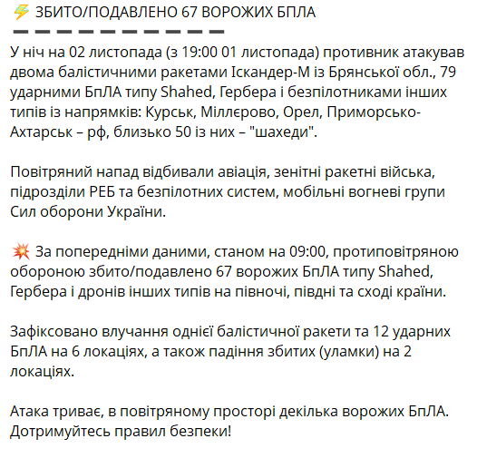 За даними військових, російська армія завдала масованого удару, використавши 79 ударних дронів типів "Шахед", "Гербера" та інших, а також дві балістичні ракети "Іскандер-М".