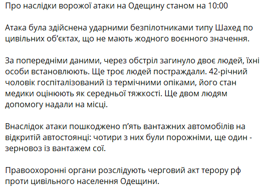Як повідомив голова Одеської обласної військової адміністрації Олег Кіпер, внаслідок російських ударів по регіону загинуло двоє людей, ще троє отримали поранення.