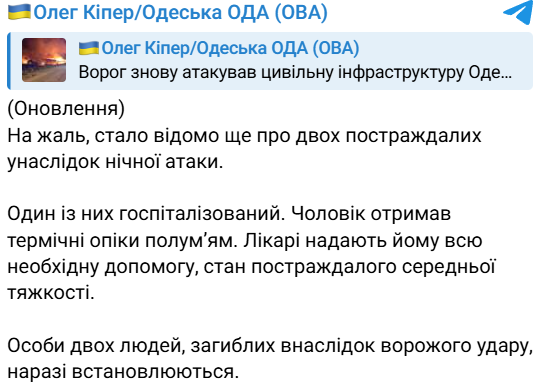 Через півгодини після повідомлення ДСНС начальник Одеської ОВ Олег Кіпер повідомив про зростання кількості постраждалих.