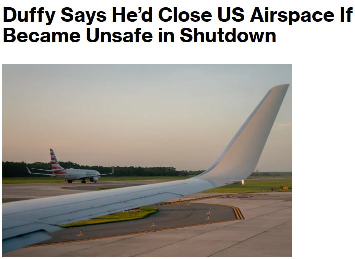 Міністр транспорту США Шон Даффі заявив, що закриє повітряний простір країни, якщо польоти стануть небезпечними через шатдаун.