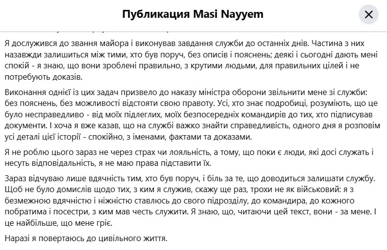 "Виконання одного із завдань призвело до наказу міністра оборони звільнити мене зі служби: без пояснень, без можливості відстояти свою правоту. Всі, хто знають подробиці, розуміють, що це було несправедливо – від моїх підлеглих, моїх безпосередніх командирів до тих, хто підписував документи. І хоча я вже говорив, що на службі важко знайти справедливість, але на службі важко знайти справедливість, але на службі важко знайти справедливість. іменами, фактами та доказами", - написав Найєм, який збирається повернутися до адвокатської практики.