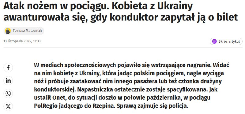 Видання пише, що жінка почала конфлікт, коли провідник запитав її про квиток: спочатку вона ображала провідника, а потім дістала ніж і погрожувала працівникові залізниці.