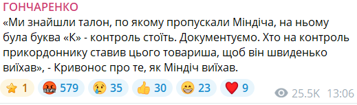 "Ми знайшли талон, яким пропускали Міндіча, на ньому була буква "К" – контроль стоїть. Документуємо, хто на контроль прикордоннику ставив цього товариша, щоб він швиденько поїхав", - передав слова Кривоноса нардеп.