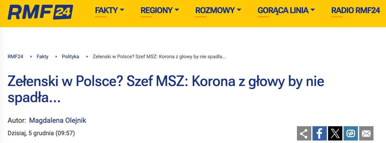 "Набридливі вимоги вибачень та почестей у ситуації, коли вони (українці - Ред. ) борються за життя, викликають у мене огиду, але з іншого боку, корона з голови Зеленського не впала б, якби, проїжджаючи через Польщу, він попросив візиту до президентського палацу", - сказав Сікорський в ефірі.
