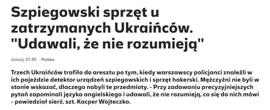 Громадяни України представилися IT-фахівцями, проте не змогли пояснити правоохоронцям, навіщо їм потрібна ця апаратура. Сержант поліції розповів журналістам, що коли правоохоронці почали ставити українцям питання щодо знайденого в машині, ті вдалися, ніби не знають англійської та не розуміють, про що в них запитують.