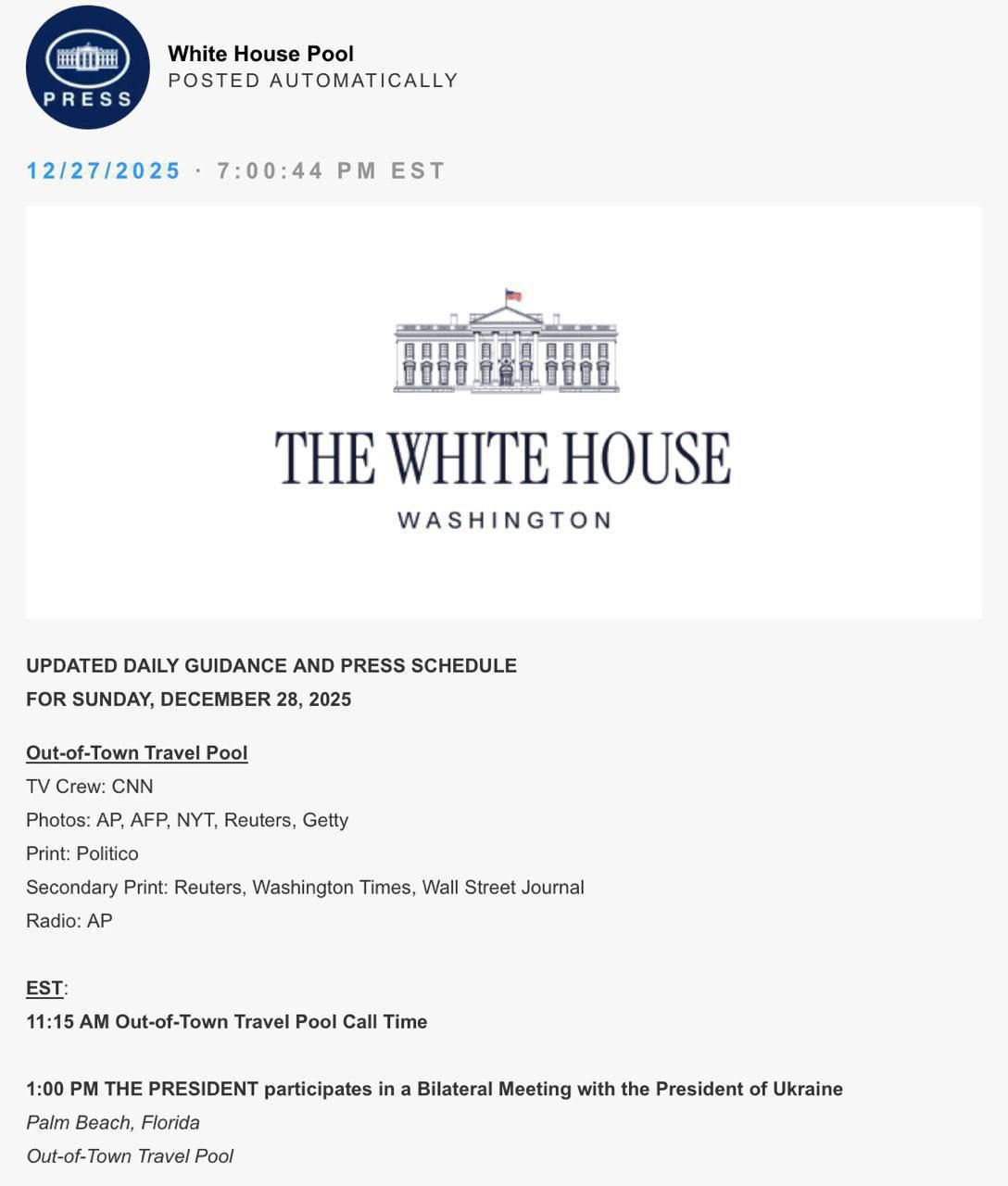 Про це повідомляє прес-пул Білого дому.