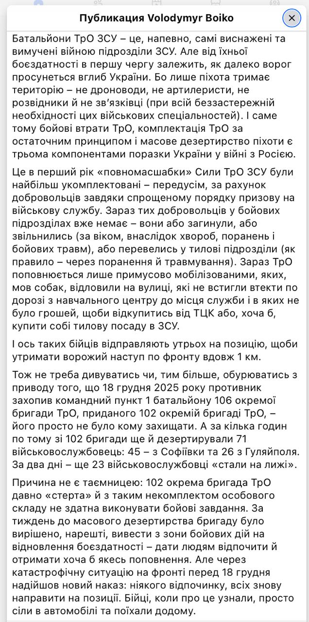 "Причина не є таємницею: 102-а окрема бригада ТрО давно "стерта" і з таким некомплектом особового складу не здатна виконувати бойові завдання. За тиждень до масового дезертирства бригаду було вирішено нарешті вивести із зони бойових дій на відновлення боєздатності – дати людям відпочити та отримати бодай якесь поповнення. Але через катастрофічну ситуацію на фронті перед 18 грудня надійшов новий наказ: жодного відпочинку, всіх знову направити на позиції. Бійці, коли про це довідалися, просто сіли в автомобілі та поїхали додому", - розповів Бойко.