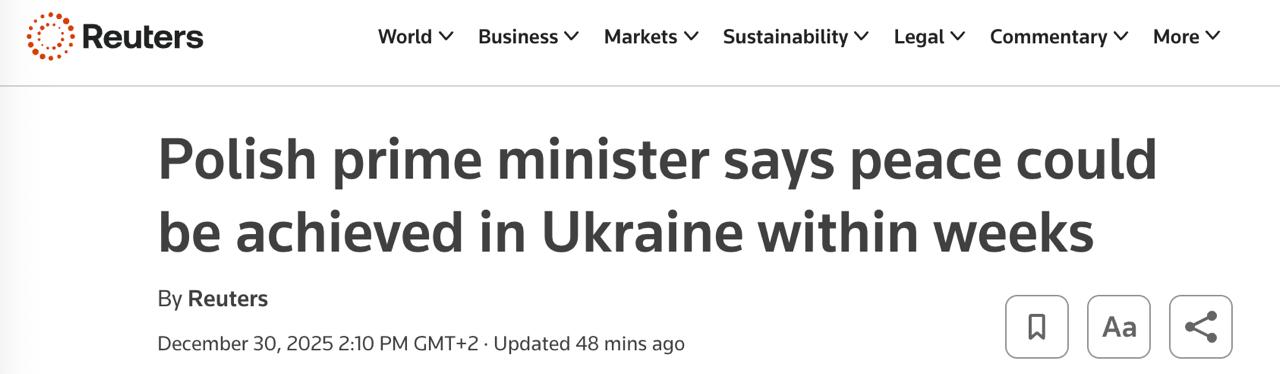 "Мир на горизонті. Немає сумнівів, що відбулися події, що дають підстави сподіватися, що ця війна може закінчитися, і досить швидко, але це все ще надія, далеко не стовідсоткова. Коли я говорю, що мир на горизонті, я маю на увазі найближчі тижні, а не місяці чи роки. До січня ми всі повинні будемо зібратися разом... щоб ухвалити рішення про майбутнє України, майбутнє цієї частини світу", - сказав Туск.