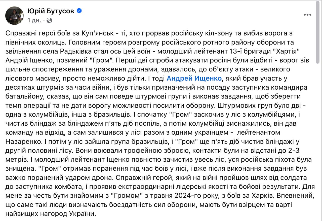 Журналіст розповів історію заступника командира батальйону 13-ї бригади "Хартія" Андрія Іщенка з позивним Грім, який разом із бразильцями та колумбійцями, що воюють за Україну, 10 діб поспіль зачищав ліс під Куп'янськом.