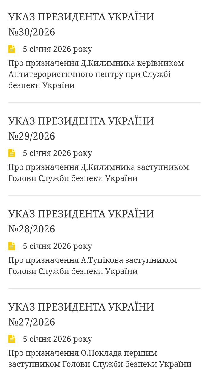 Також Зеленський прибрав з посад заступників голови Олександра Поклада та Сергія Наумюка, начальника Департаменту контррозвідки Андрія Тупікова та начальника Департаменту військової контррозвідки Олександра Дубровіна, але при цьому Поклад призначений першим заступником голови СБУ, Тупіков та Денис Килимник – заступниками голови центру.
