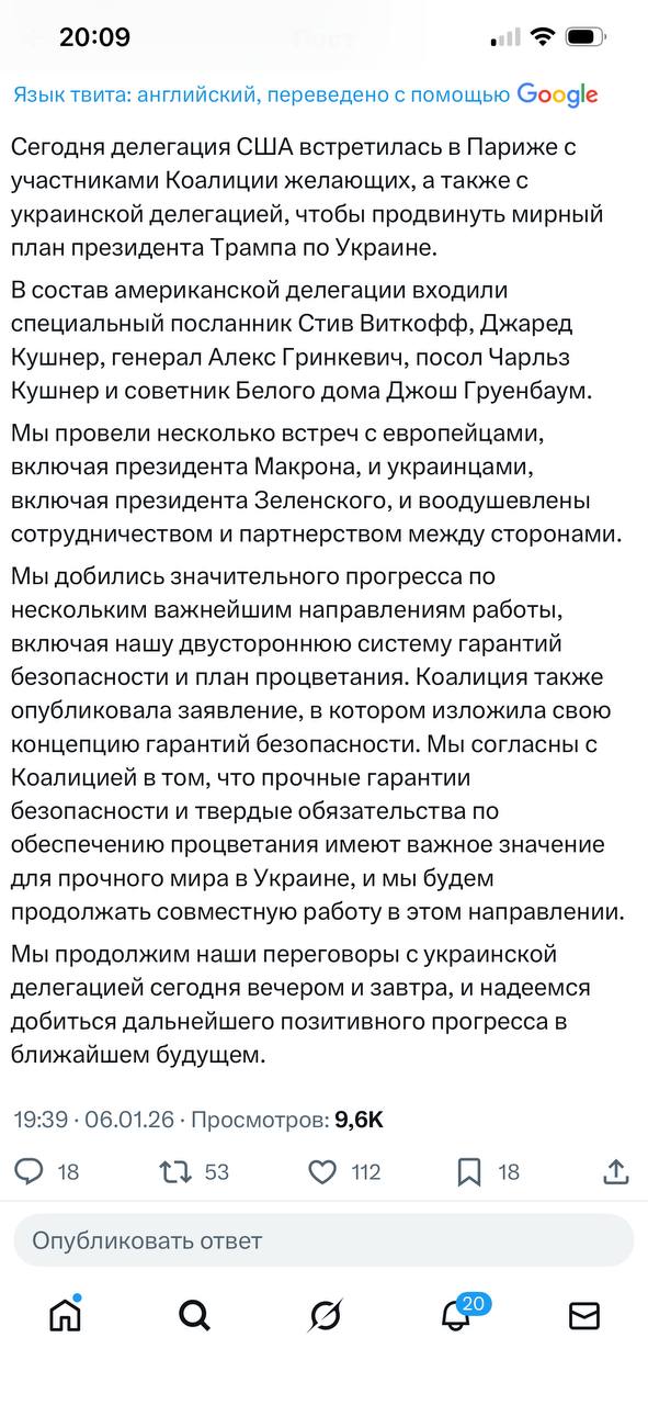 Публікуємо повну заяву Віткоффа за підсумками переговорів із "коаліцією бажаючих" у Парижі щодо гарантій безпеки України.