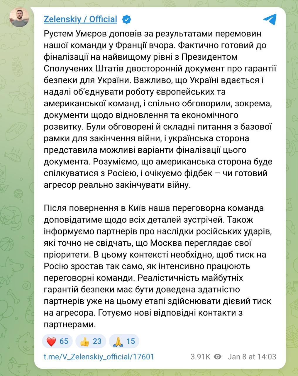 За його словами, секретар РНБО Рустем Умеров доповів йому, що на переговорах у Франції делегації України та США обговорювали "складні питання щодо базової рамки для закінчення війни, і українська сторона подала можливі варіанти фіналізації цього документа". Наразі очікуються переговори представників США та РФ та реакція Москви на підготовлені документи.