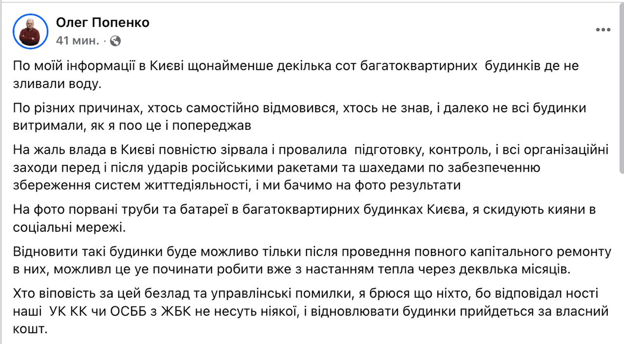 "На жаль, влада в Києві повністю зірвала і провалила підготовку, контроль і всі організаційні заходи щодо забезпечення збереження систем життєдіяльності перед ударами і після ударів російськими ракетами та дронами, і ми бачимо результати. Відновити такі будинки буде можливо тільки після проведення повного капітального ремонту в них. Це можна починати робити вже з настанням тепла", - сказав він.