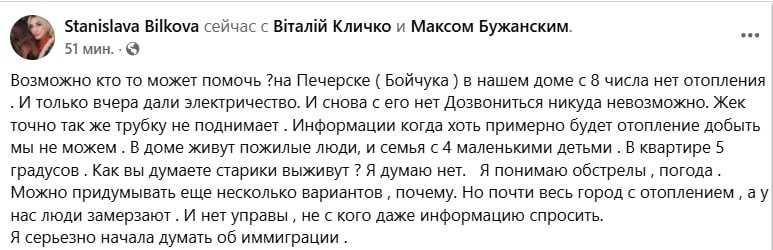 У свою чергу мешканка будинку на вулиці Бойчука (Печерський район) Станіслава Білкова повідомляє на своїй сторінці у Фейсбуці, що опалення у ньому немає з 8 січня, електрику дали вчора, але сьогодні знову відключили. У квартирах, за її словами, 5 градусів.