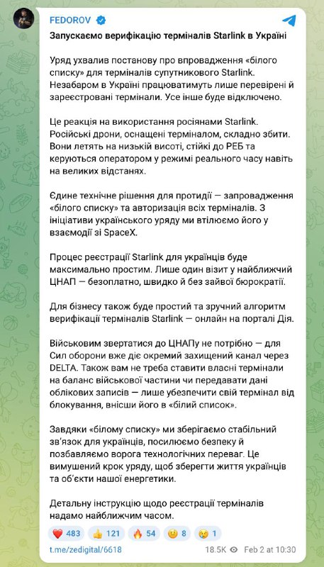 "Єдине технічне рішення для протидії - запровадження білого списку та авторизація всіх терміналів. За ініціативою українського уряду ми реалізуємо його у взаємодії зі SpaceX. Процес реєстрації Starlink для українців буде максимально простий. Тільки один візит до найближчого ЦНАП - безкоштовно, швидко і без зайвої бюрократії. Для бізнесу також буде простий і зручний написав чиновник.