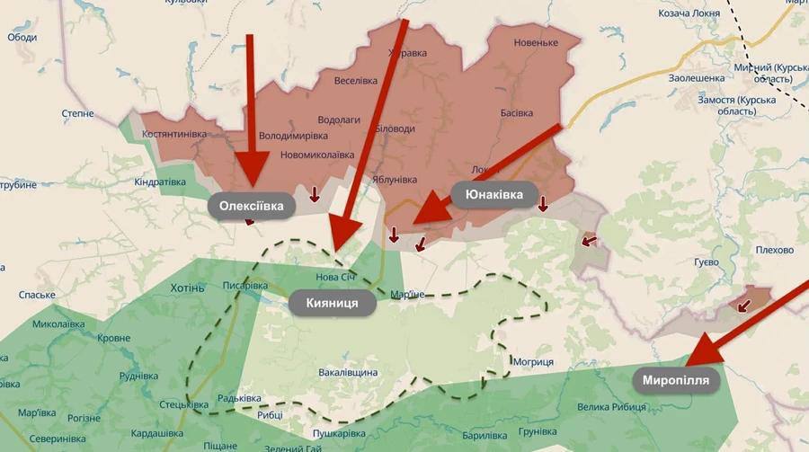 Оосновним напрямком наступу залишається захоплена росіянами ділянка між селами Олексіївка – Яблунівка – Юнаківка. З цього боку у росіян одразу три «гілки», вздовж яких вони тягнуться до сіл Хотень, Писарівка, Нова Січ.