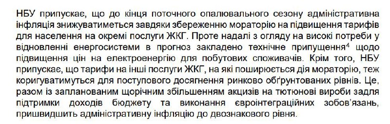 "Враховуючи високі потреби у відновленні енергосистеми, у прогноз закладено технічне припущення щодо підвищення цін на електроенергію для споживачів. Крім того, НБУ передбачає, що тарифи на інші послуги ЖКГ, на які поширюється дія мораторію, також коригуватимуться для досягнення ринково обґрунтованих рівнів", - йдеться в документі.