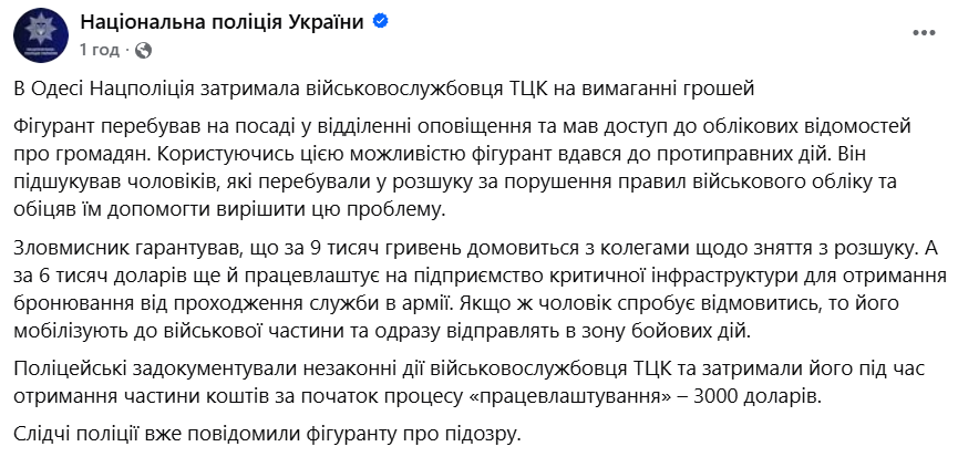 Поліцейські задокументували незаконні дії співробітника ТЦК та затримали його під час отримання частини коштів за початок процесу "працевлаштування" - 3000 доларів.