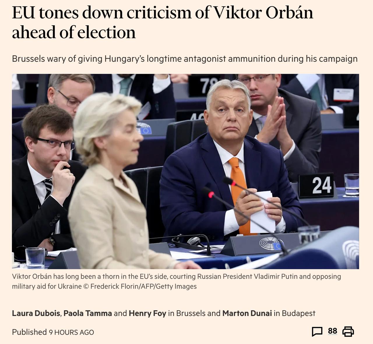 Зазначимо, що публікація в Financial Times з'явилася невдовзі після заяв президента України Володимира Зеленського, які викликали великий резонанс, на адресу Орбана. Виходячи з тексту статті, європейська влада вирішила обрати зовсім іншу, ніж Зеленський, тактику щодо угорського прем'єра.